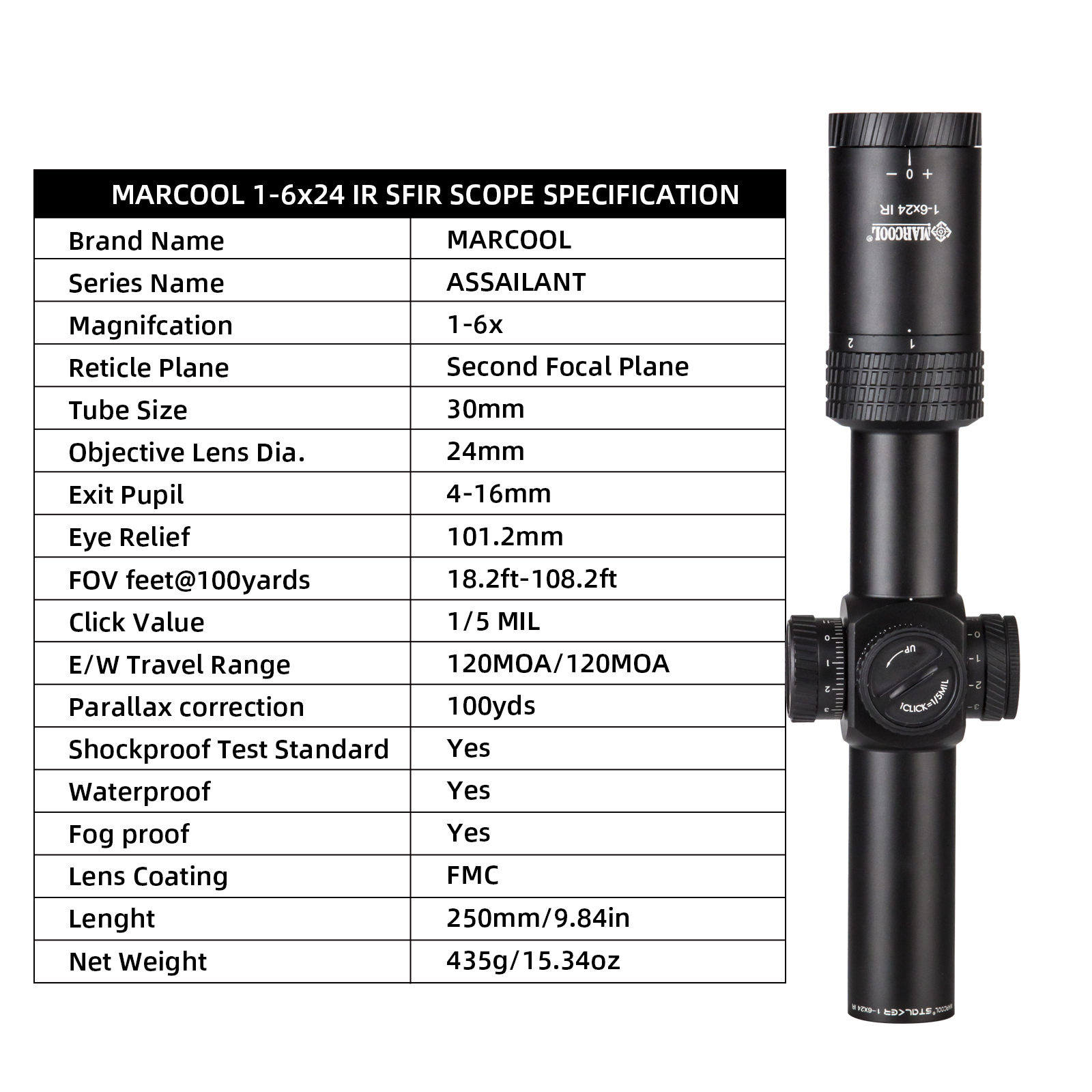 | •Elevation/Windage Adjustment Range: | 120MOA/120MOA |